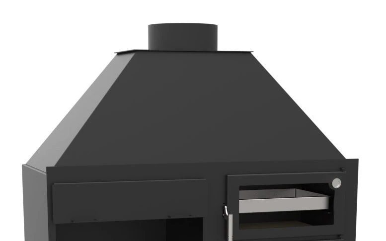 Al lado derecho de la barbacoa, y adherido a ella, se encuentra un horno de leña de doble combustión y puerta de fundición, también fabricado en Acero al carbono de 4 mm. y con el interior de la cámara de combustión de vermiculita.