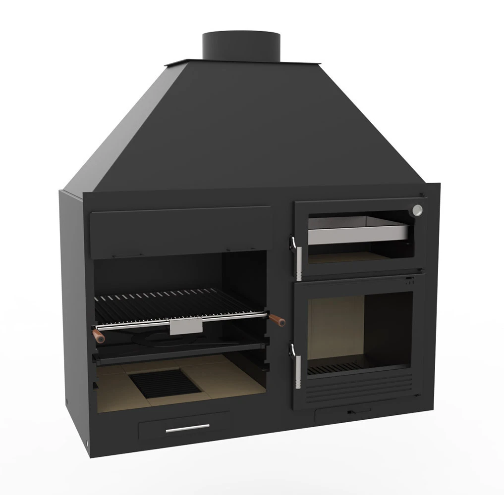 Incluye un termómetro incorporado para controlar la cocción de nuestros alimentos. La parrilla de la cámara de combustión es de fundición, el horno es desmontable y el sistema de limpieza es igual al de la barbacoa.