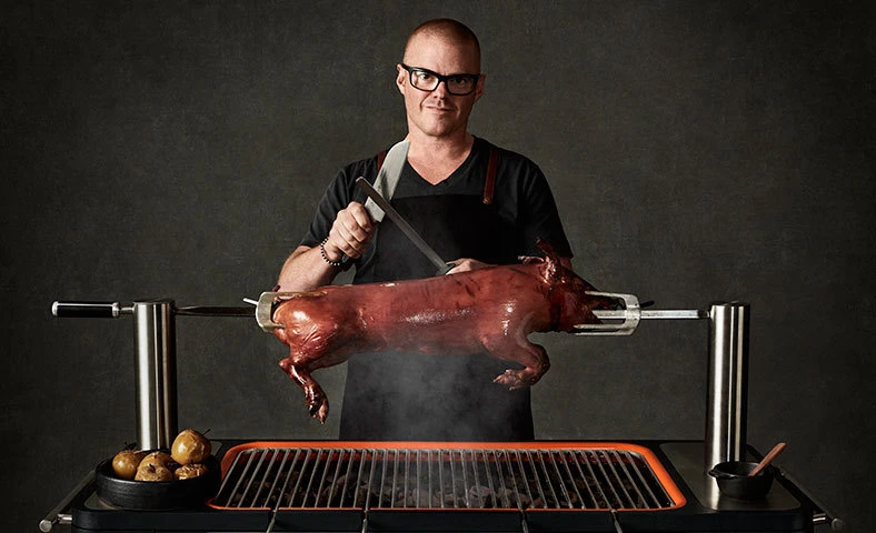 Amigo tanto de la Royal Society of Chemistry, y The Royal Academy of Culinary Arts, a Heston nunca le ha gustado seguir el libro al pie de la letra. Impulsando los límites de la cocina tradicional, e inyectando la ilusión de los deseos de un niño y el teatro en todo lo que toca, ha inspirado a una generación que busca el placer, y la diversión en la comida. Ahora, Heston le da su toque mágico al disfrute del exterior, haciendo fácil para cualquiera el cocinar con una barbacoa.