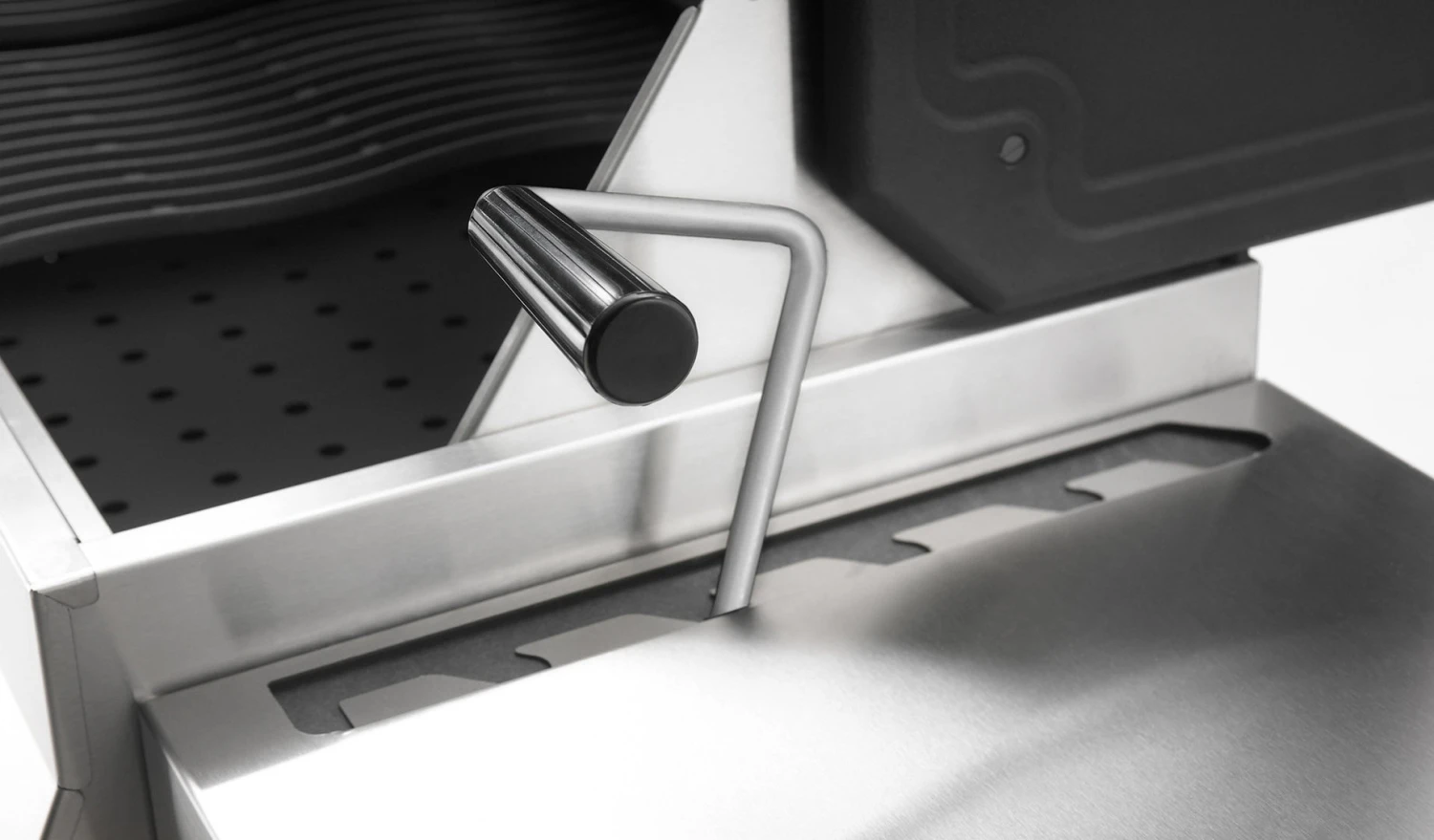 Esta tapa utiliza el centro de gravedad para elevarse suavemente sin sobrepasar la parte posterior de la parrilla y ahorrar espacio.