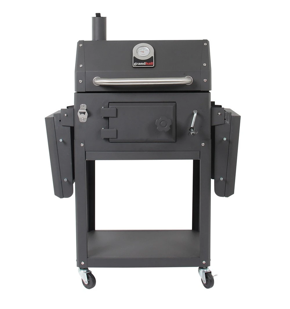 Esta barbacoa viene muy equipada de serie, incluyendo un práctico abridor para botellas, ganchos porta utensilios, una bandeja para las brasas que se puede ajustar en altura fácilmente con la manivela situada en la parte delantera de la barbacoa, termómetro integrado en la tapa y los estantes laterales son plegables lo que lo hacen perfecta para guardarla.