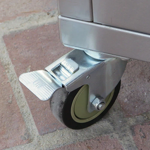 – 4 ruedas de acero pesado giratorias, 2 de ellas con freno.