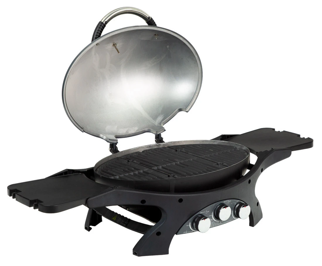 La parrilla de gas portátil Pit Boss Sportsman 3 también incluye un termómetro integrado en la tapa, pomos y asas cromados, estantes laterales plegables con ganchos para herramientas que facilitan el transporte y protegen del viento, y una bandeja extraíble para la grasa.