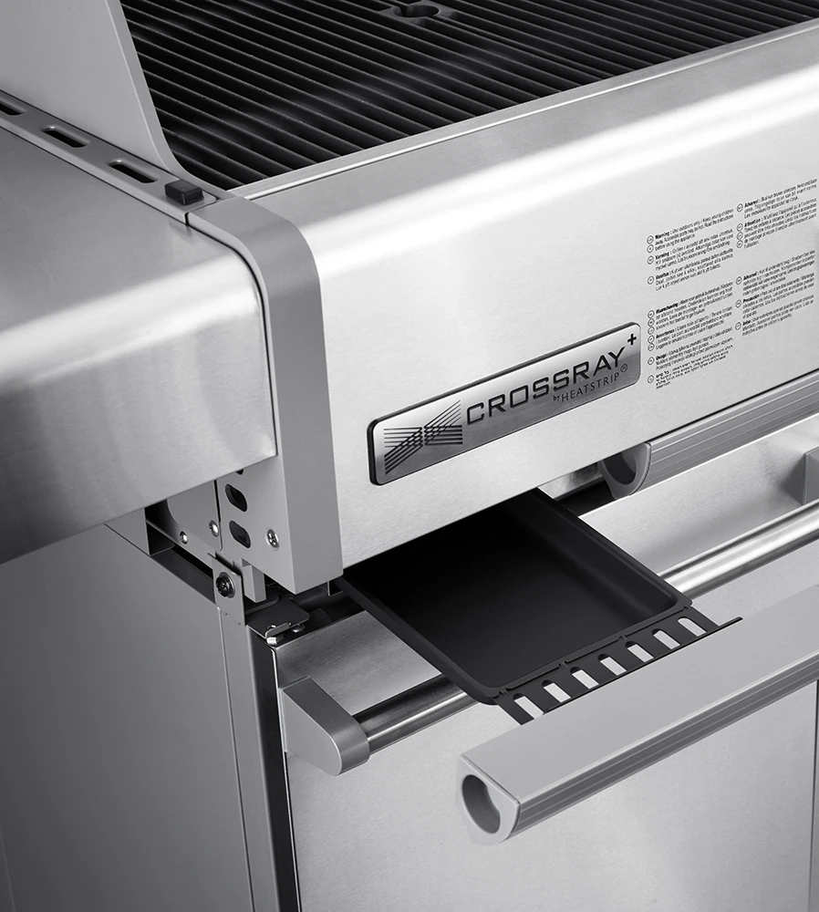 El sistema patentado Crossray utiliza quemadores infrarrojos instalados lateralmente y orientados hacia arriba, apuntando a la superficie de cocción. Gracias a este sistema, las prestaciones son superiores a las de cualquier barbacoa tradicional. El calor infrarrojo penetra en la comida, manteniéndose fresca y jugosa por dentro y sellándola por fuera.