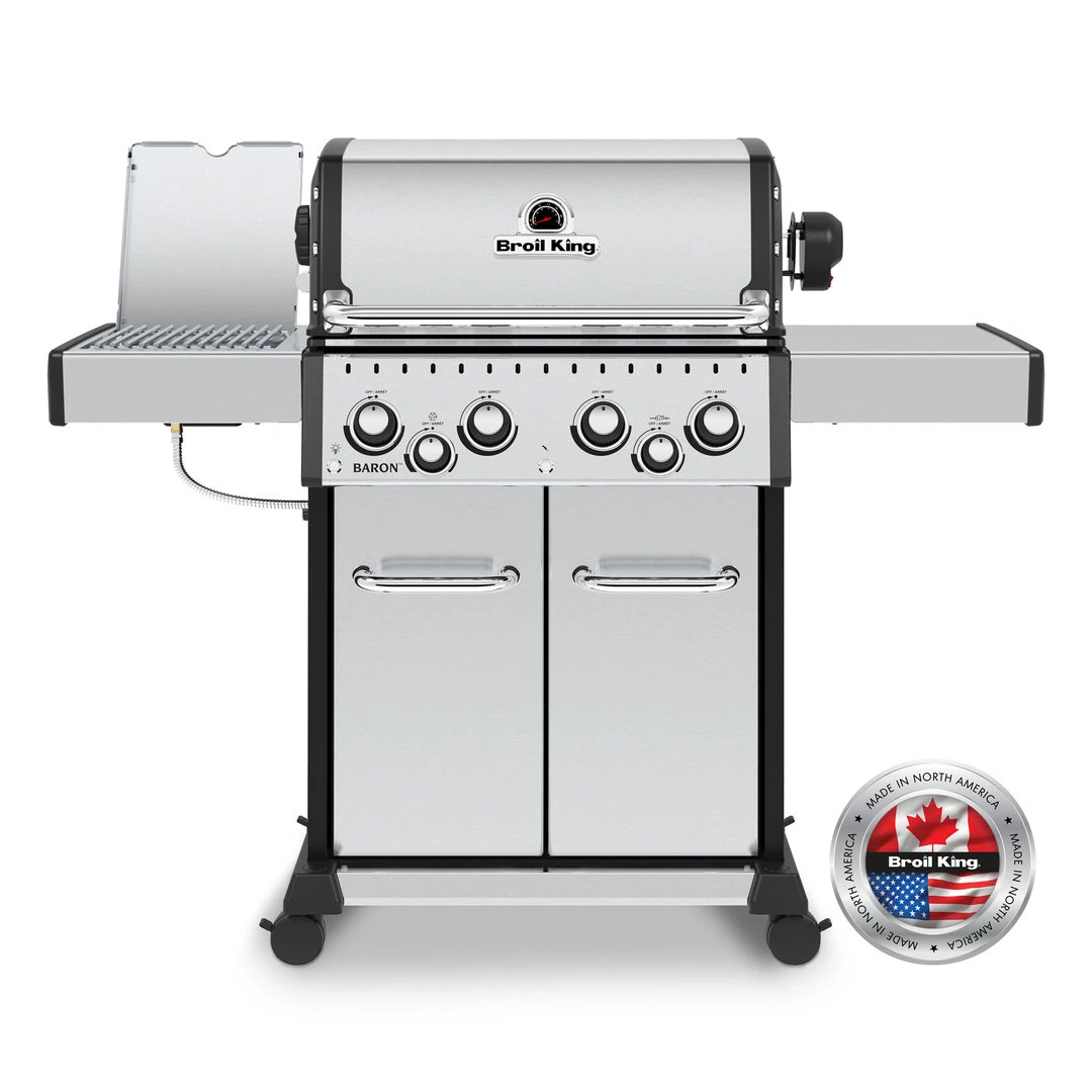 Las barbacoas Broil King de la serie Baron son fabricadas con los mejores materiales, tiene una amplia zona de cocción y son muy potentes satisfaciendo con creces nuestras necesidades. Las robustas parrillas de cocción son de hierro fundido y hacen que retengan el calor con lo que conseguiremos dorar rápidamente nuestros alimentos además son reversibles por un lado son canales huecos v y por el otro son en ^ ideal para dorar y marcar alimentos. Su amplia tapa es perfecta para utilizar nuestra barbacoa como un horno (cocción indirecta) perfecto para asar ternera, pavo, etc. Las barbacoas están construidas con una altísima calidad y con una potencia insuperable.