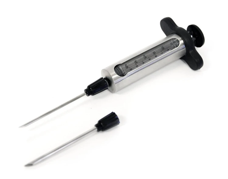 Un gran accesorio para inyectar salsas y marinados a los alimentos. Incluye una aguja gruesa y otra más fina, además incorpora una ventana con marcas graduadas para controlar exactamente la cantidad de salsa a inyectar.