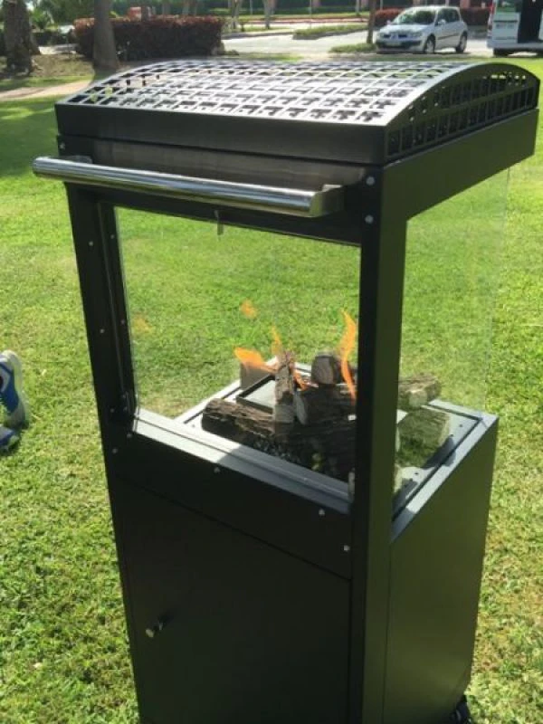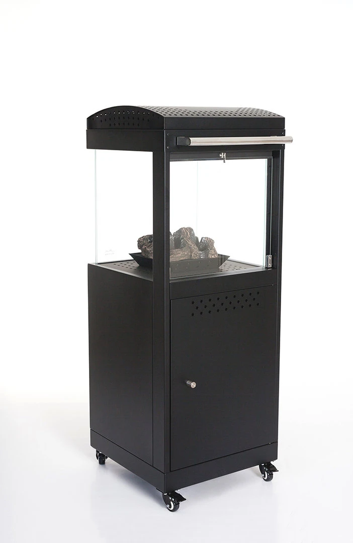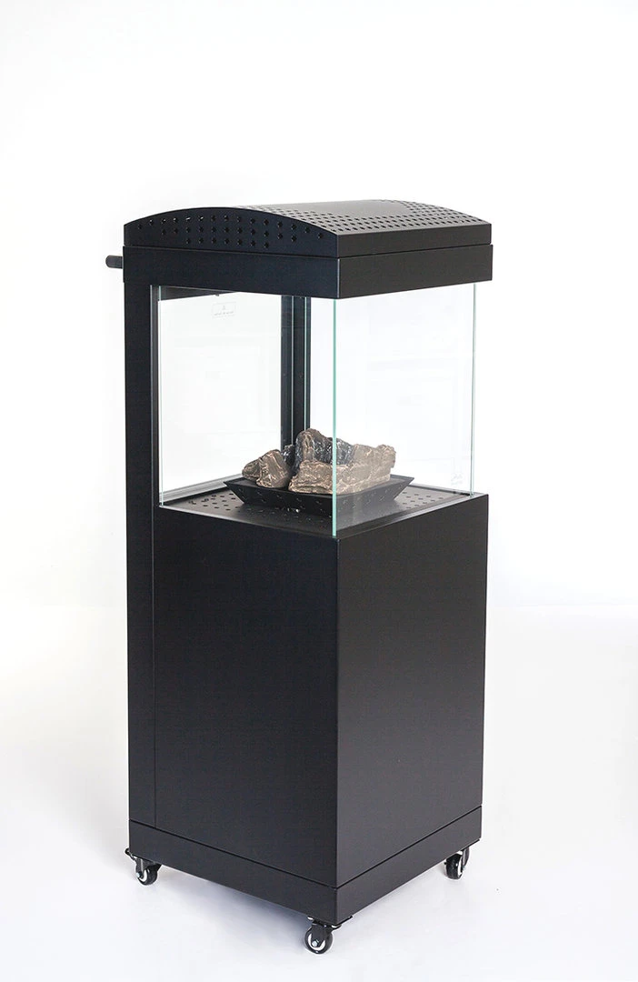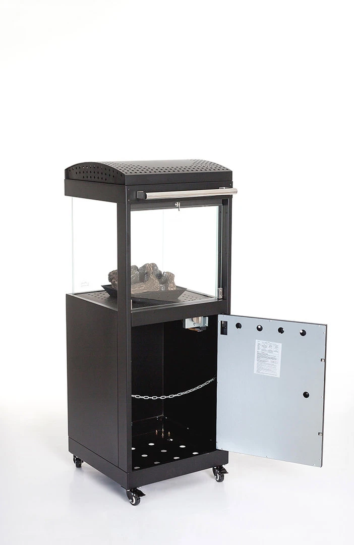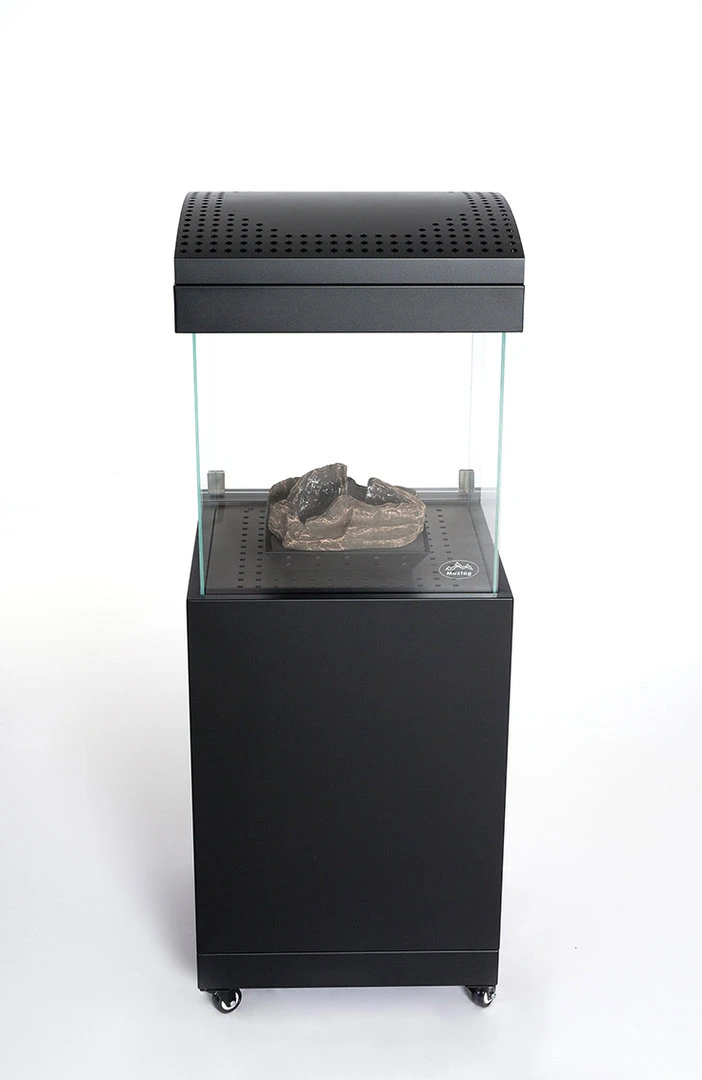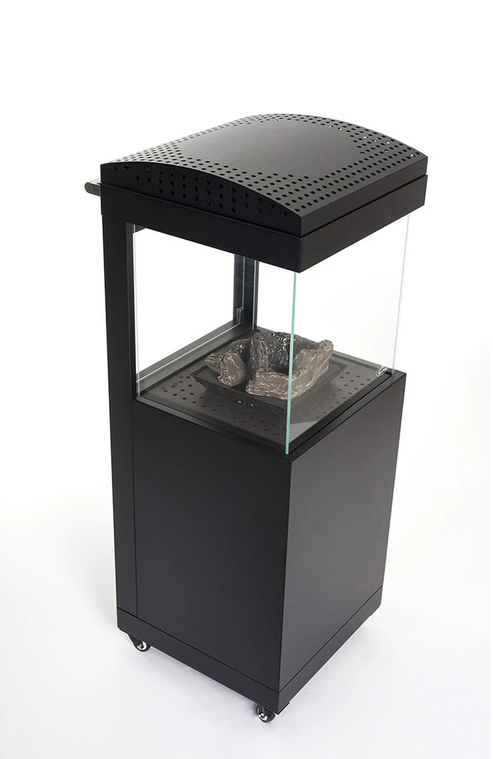 La estufa Bergen es un calentador de terraza móvil que trabaja con gas butano y propano, combinando el fuego visible con el calor que desprende este. Gracias a su llama alimentada por los troncos cerámicos, el calor circula en el interior y se exterioriza por los cuatro lados de la parte superior. Además gracias al calentamiento del cristal protector, también emite calor infrarrojo a corta distancia.