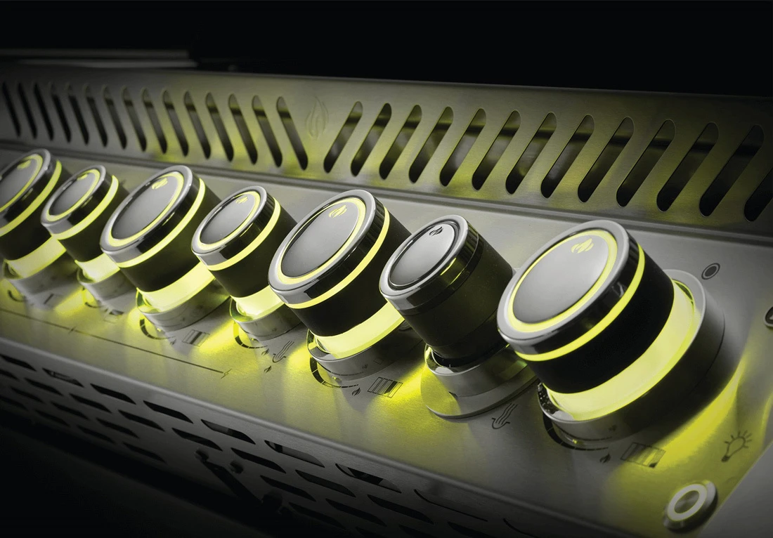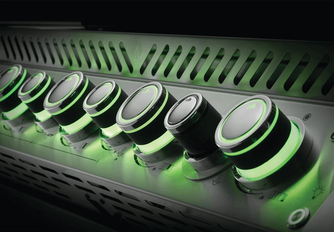 Los mandos iluminados con luz LED de esta barbacoa pueden ajustarse al color que desee. Cuando se ajusta al verde, los mandos comienzan a recorrer todos los colores. Es muy bonito poder dejar que pasen constantemente los colores, o que se detengan cuando lleguen al color en él que quieres que permanezcan. Incluso puedes ponerlos en el color de tu equipo favorito para el día del partido. La Napoleon Prestige Pro está hecha para ser llamativa.