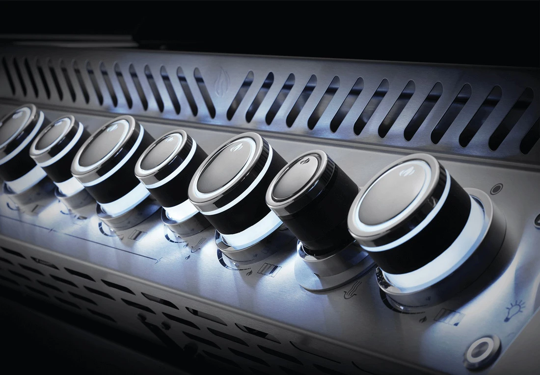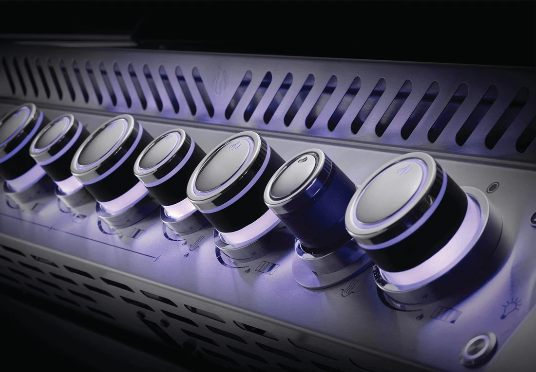 La Napoleon Prestige Pro 665 también cuenta con el logotipo de Napoleon proyectado en el suelo, que le invita a usar a la barbacoa. No vuelva a dejarse la barbacoa encendida, ya que todas las barbacoas de la serie Prestige vienen con la función SafetyGlow, en la que los mandos de control se iluminan en rojo cuando el quemador está encendido. Por supuesto, con el exterior de Acero Inoxidable 304 de esta barbacoa y los bordes pulidos de cromo, quedará muy bien a cualquier hora del día en su espacio exterior.