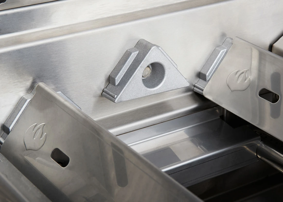 Los protectores de llama de Acero Inoxidable 304 de doble nivel de Napoleon proporcionan una gran cobertura para dispersar el calor uniformemente procedente de los quemadores inferiores. La forma de ^ de los protectores de llama hace que la grasa caiga rápidamente, evitando que se produzcan llamaradas. El diseño de doble nivel de los protectores de llama proporciona una protección adicional asegurando que los goteos se evaporen, incluso entre cada quemador. Cada protector de llama tiene un orificio, lo que facilita ver los quemadores que están encendidos, desde la superficie de la parrilla.