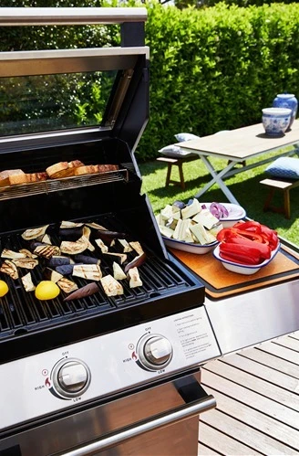 – Otras características de la barbacoa: indicador de temperatura, rejilla para calentar, cocción con capota hacia arriba o hacia abajo, bandeja recolectora de grasa, antirreflectante.